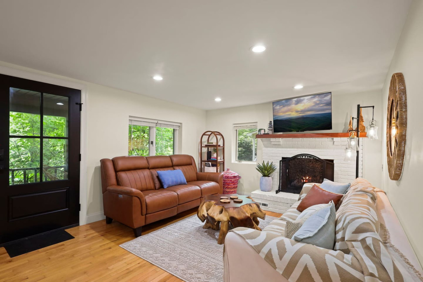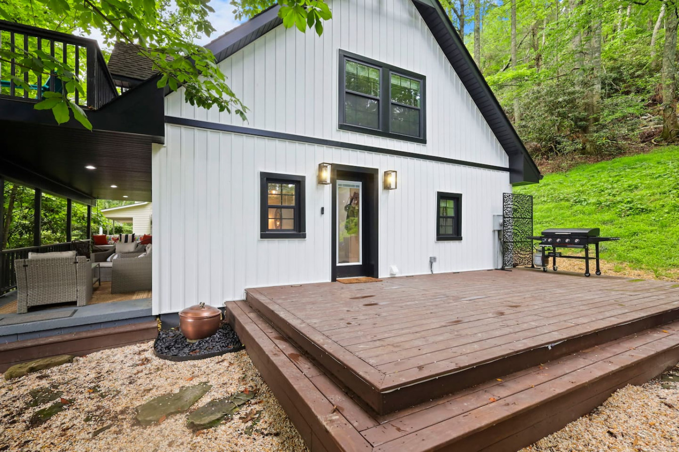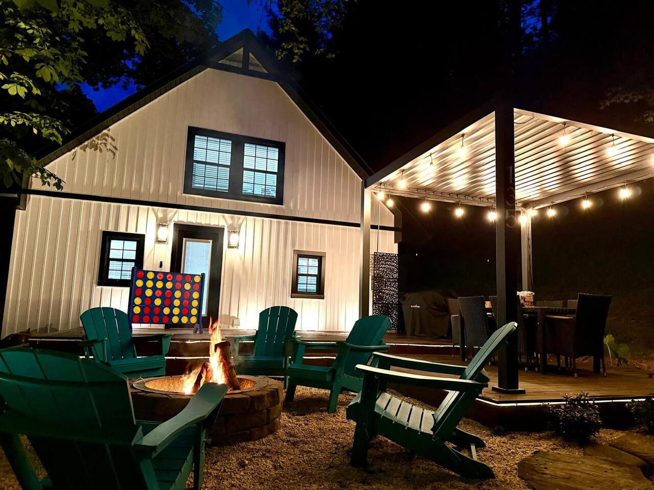 / nightBlue Ridge Peaceful Perch | 3BR/2BA Mountain Escape Near Boone & Blowing Rock Discover your mountain retreat at this stylish 3-bedroom, 2-bath getaway tucked among the trees in the heart of the Blue Ridge Mountains. Located just minutes from Boone, Blowing Rock, Banner Elk, Sugar Mountain, and Valle Crucis, this cozy yet modern cabin offers the perfect blend of comfort, convenience, and charm. Relax on the porch swing with your morning coffee, grill on the spacious deck, or wind down by the fire pit under the stars. Whether you’re here for hiking, skiing, fishing, or simply unwinding, Peaceful Perch is the perfect basecamp for your High Country adventures. Home Features Spacious 2-story layout with warm, modern mountain charm Upstairs: Master bedroom with king bed & 55" Smart TV Bedroom with queen/twin bunk bed & 46" Smart TV Cozy reading nook with forest views—perfect for coffee or wine Main Level: Bedroom with queen bed & 46" Smart TV Open-concept living room with fireplace & Smart TV Chef’s kitchen with farmhouse sink, stainless steel appliances, and custom dining table Full laundry area with washer/dryer and pantry Outdoor Living Large covered front porch with a comfy daybed swing Private balcony nestled in the trees Back deck with pergola, outdoor dining table, and gas grill Fire pit area with seating—ideal for s’mores and stargazing Prime Location 2 minutes to Valle Crucis Park and the Original Mast General Store 10 minutes to Boone and Appalachian State University 15 minutes to Banner Elk and Blowing Rock 20 minutes to Sugar Mountain Ski Resort and Grandfather Mountain Close to the Watauga River for trout fishing, picnics, and nature walks Nearby Activities Hiking & Nature: Grandfather Mountain, Moses Cone Park, Blue Ridge Parkway trails Skiing & Snowboarding: Appalachian Ski Mountain, Sugar Mountain, Beech Mountain Golf Courses: Sugar Mountain, Boone Golf Club, Linville, Diamond Creek, Elk River Club Wineries & Breweries: Banner Elk Winery, Grandfather Vineyard, Linville Falls Winery, Eagles Nest Winery, plus local craft breweries with live music Family Fun: Valle Crucis Park playgrounds, trout fishing, tubing, gem mining, and mountain zip lines Why Guests Love It From the cozy fireplace to the daybed swing on the porch, every detail is designed for comfort and relaxation. Families love the bunk room and spacious layout, while couples enjoy the private balcony and peaceful setting. After a day exploring Boone, Blowing Rock, or Sugar Mountain, gather around the fire pit for s’mores under the Carolina mountain sky.